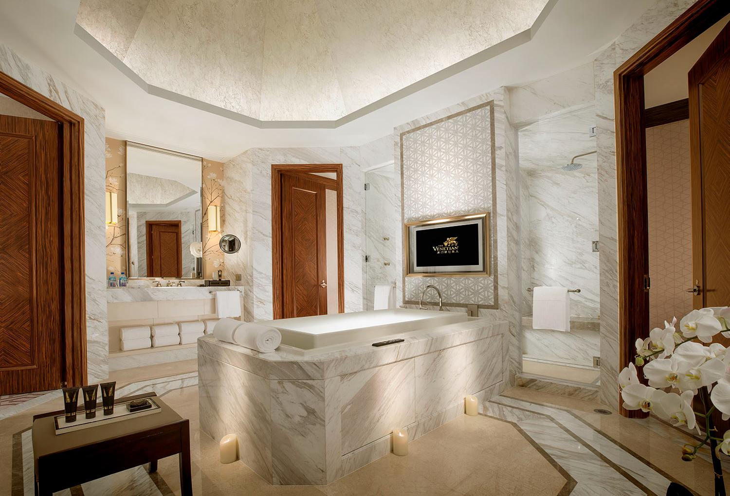 - バスタブとシャワーブースが独立したデラックスな大理石のバスルーム
