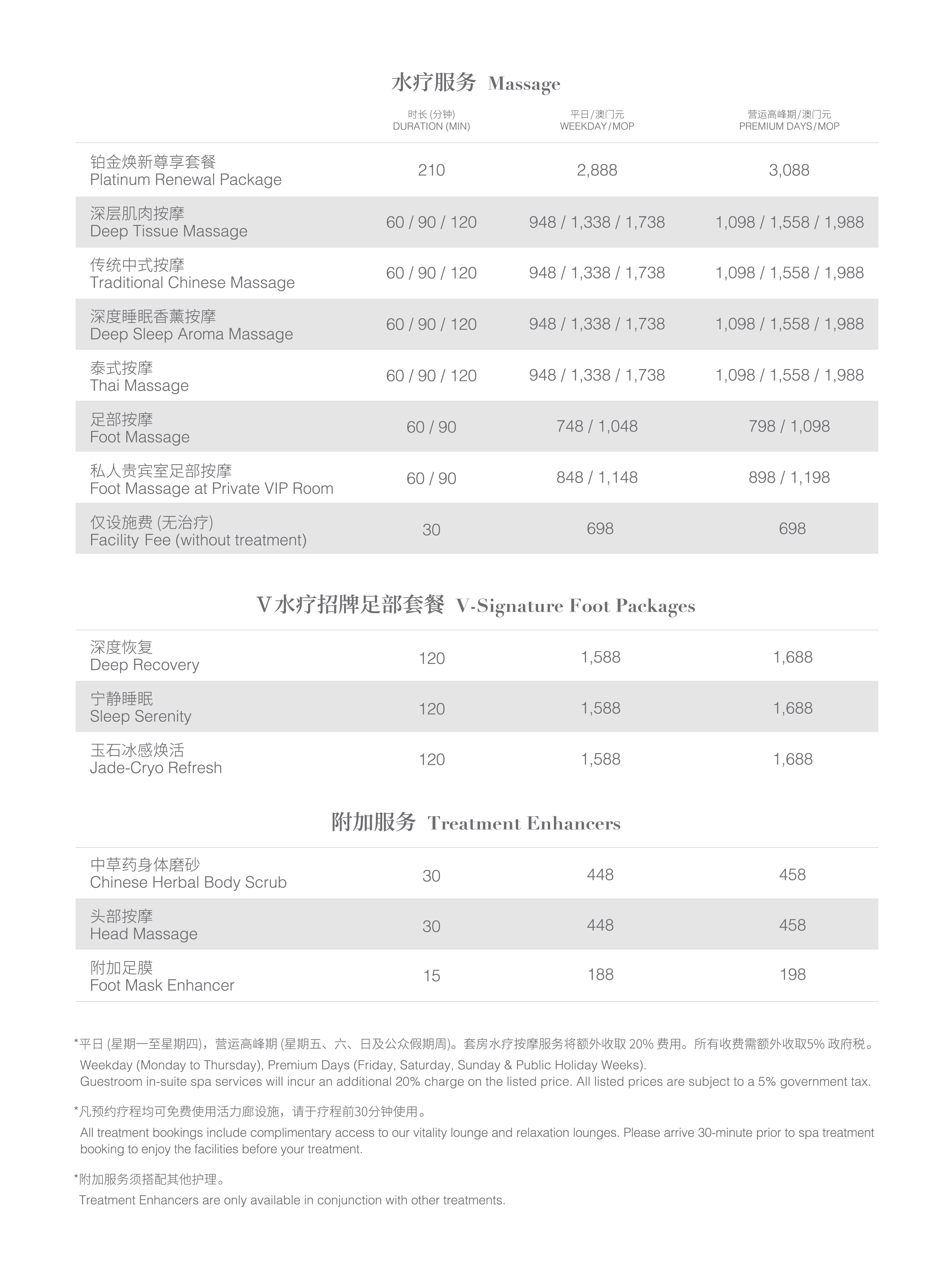 V水療佔地超過1,200平方米,提供傳統的中式足部反射療法和按摩療程。設有分別為男性和女性賓客而設的獨立休息室和專屬百家乐,包括桑拿、按摩池、蒸汽浴室等,其內亦設傳統的磨砂室和豪華的護理後茶室。