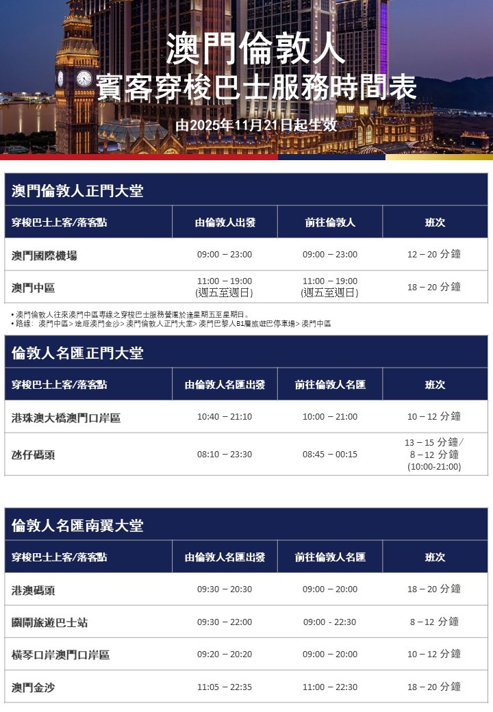 · 澳门倫敦人免費穿梭巴士時間表